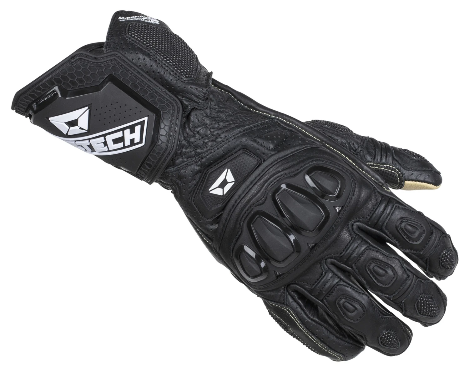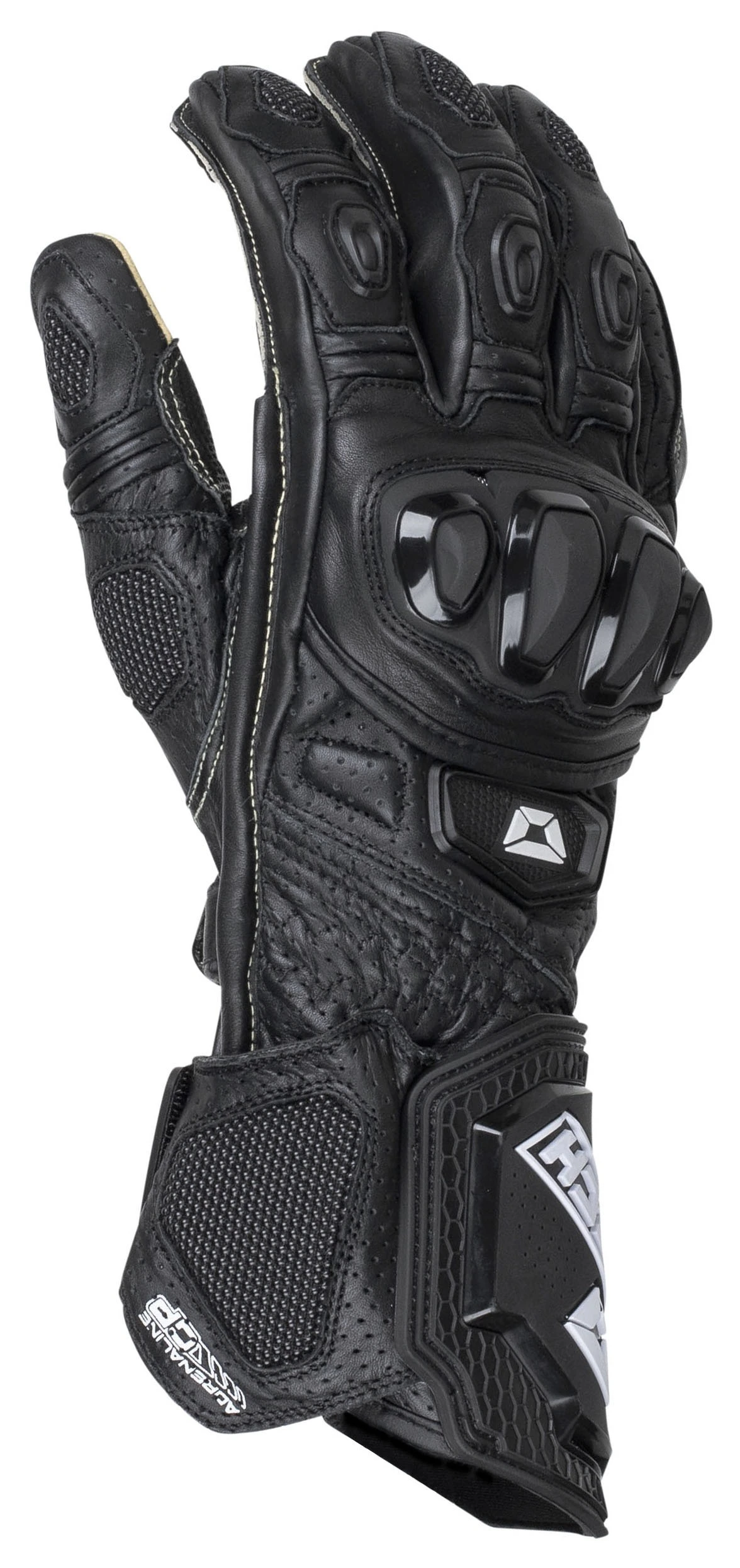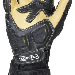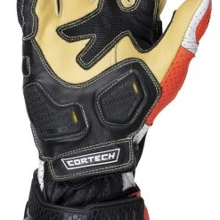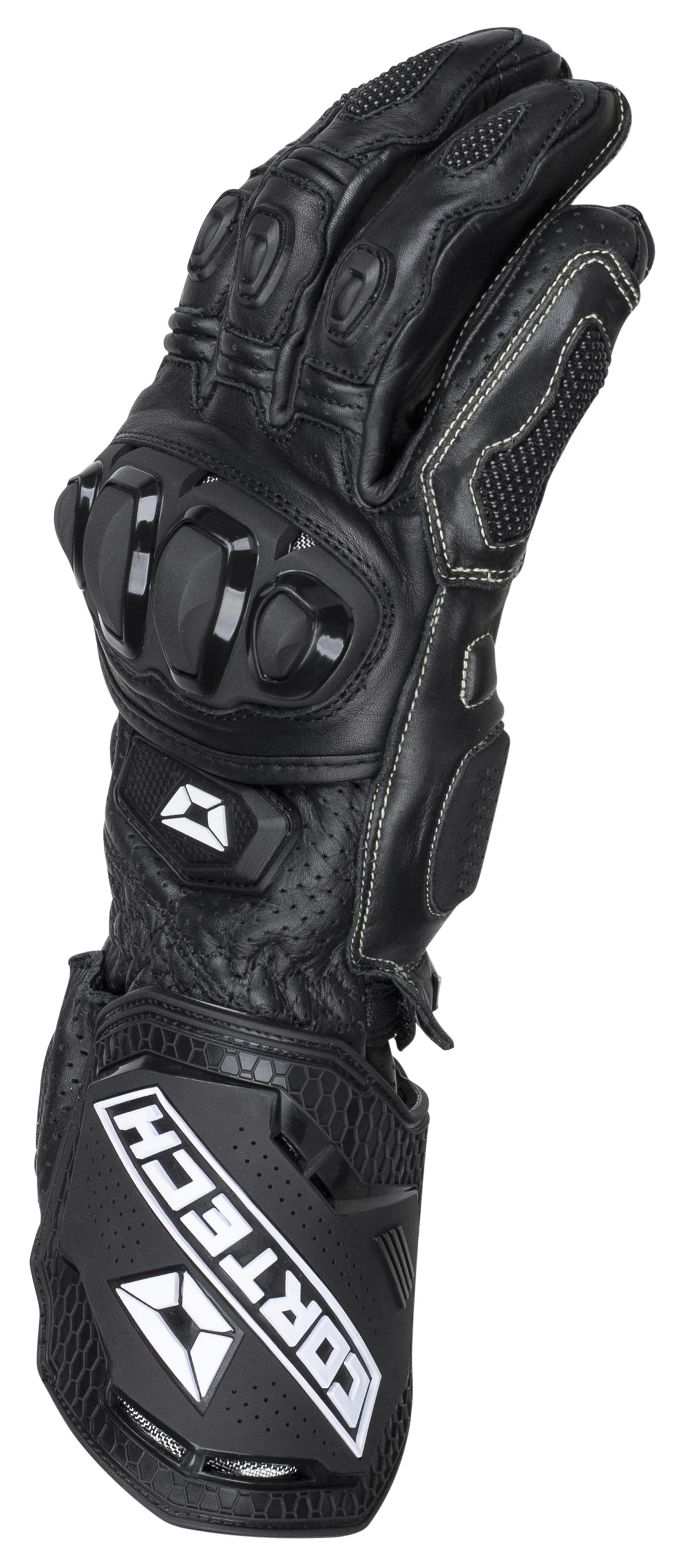The Adrenaline GP Gloves are Cortech’s top level, gauntlet race glove. The Adrenaline GP Gloves use a combination of cowhide and goat leather to balance protection, comfort and bar feel. Digital leather overlays at the index, middle finger and crook of palm ensure a tight grip regardless of the pace. Knox supplies the Scaphoid Protection System, which is designed to reduce impact and abrasion injuries. Superfabric inserts along the finger backs, thumb and sides of hand provide a flexible armor solution with ultra-high resistance to heat and abrasion. When the throttle twists and the blood starts pumping, Coolmax insulation and dual hook and loop closures keep the Adrenaline GP Gloves securely in place.Â