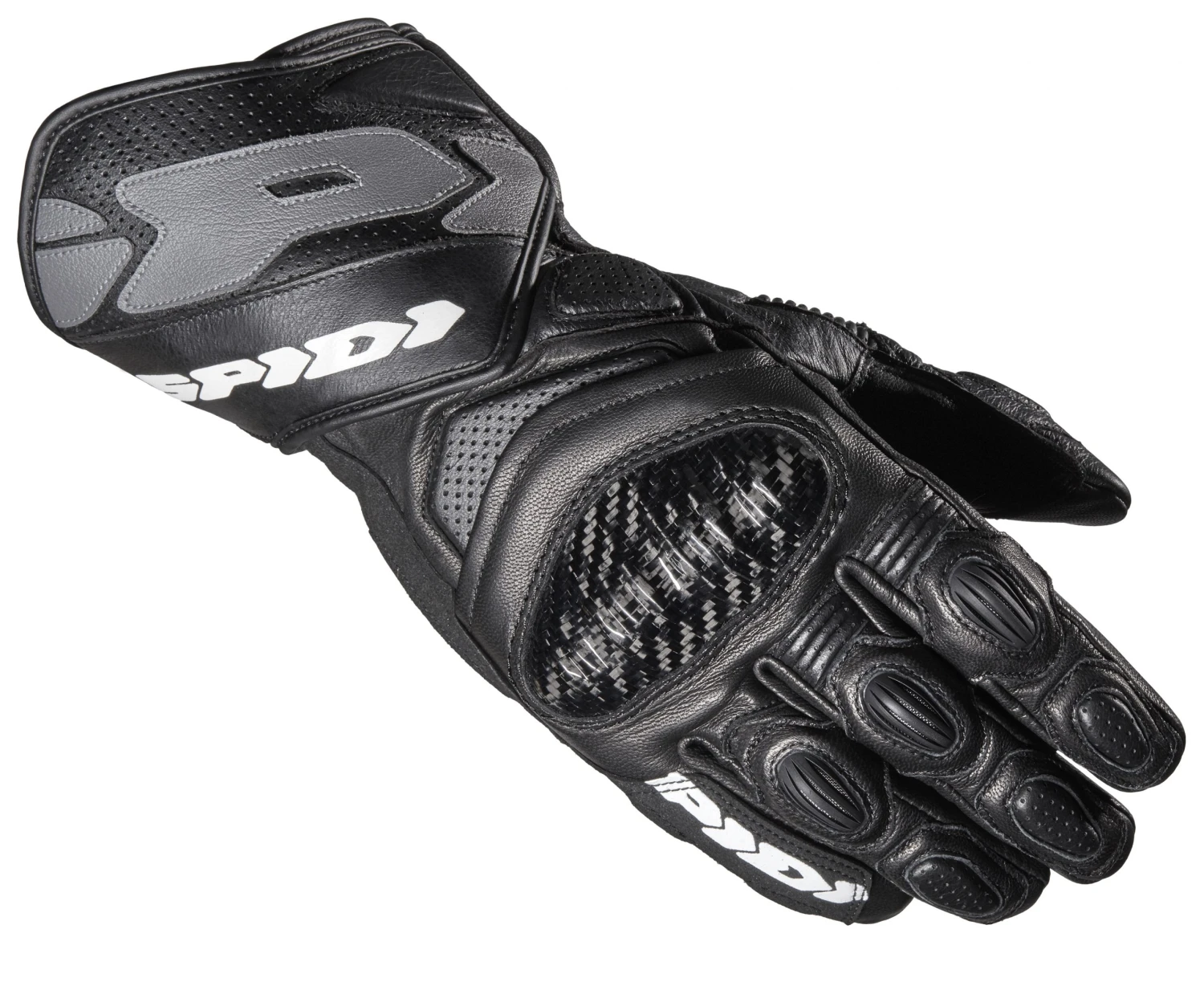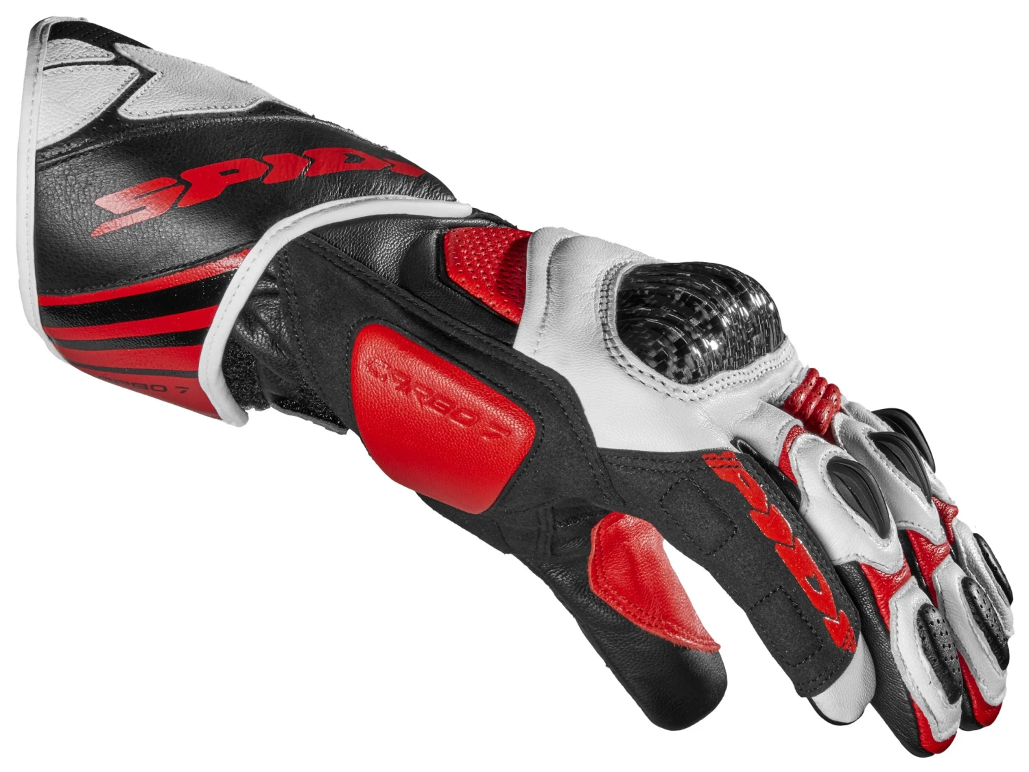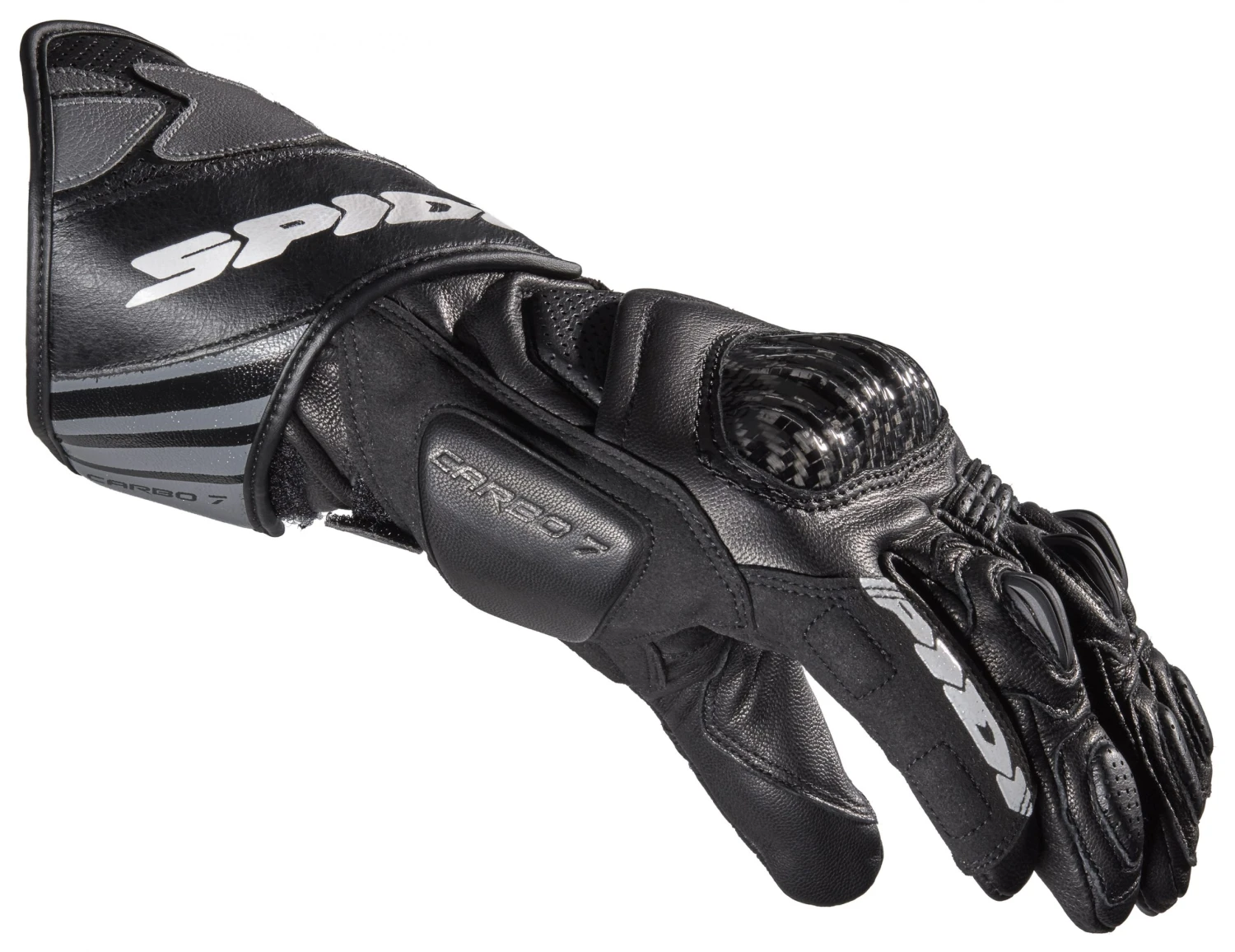 The Carbo 7 is the latest version of the highly-technical Carbo-series competition gloves from Spidi. Trusted by professional racers and certified to Level 1 EN 13594:2015 KP CE, the Carbo 7 Gloves use full goatskin leather construction. Carbon fiber armor is fitted over the knuckles, and high-density padding on the palm, side and back of hand help dissipate impacts. Vents and perforation help regulate temperatures as the pace picks up. To cover the wrist bones and keep the gloves secure, the Carbo 7s have dual hook and loop adjusters for the perfect fit.Â