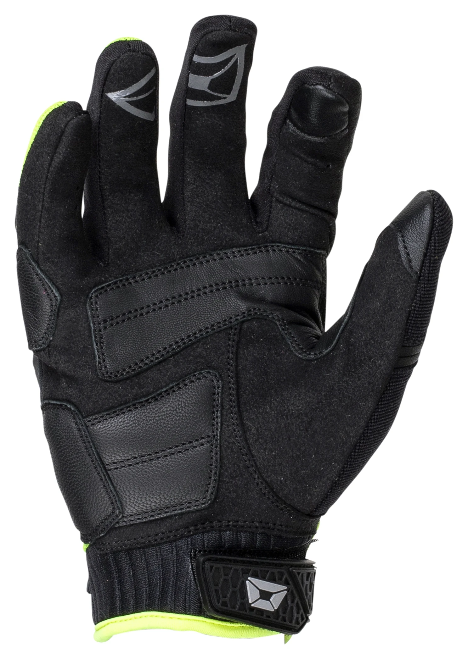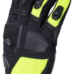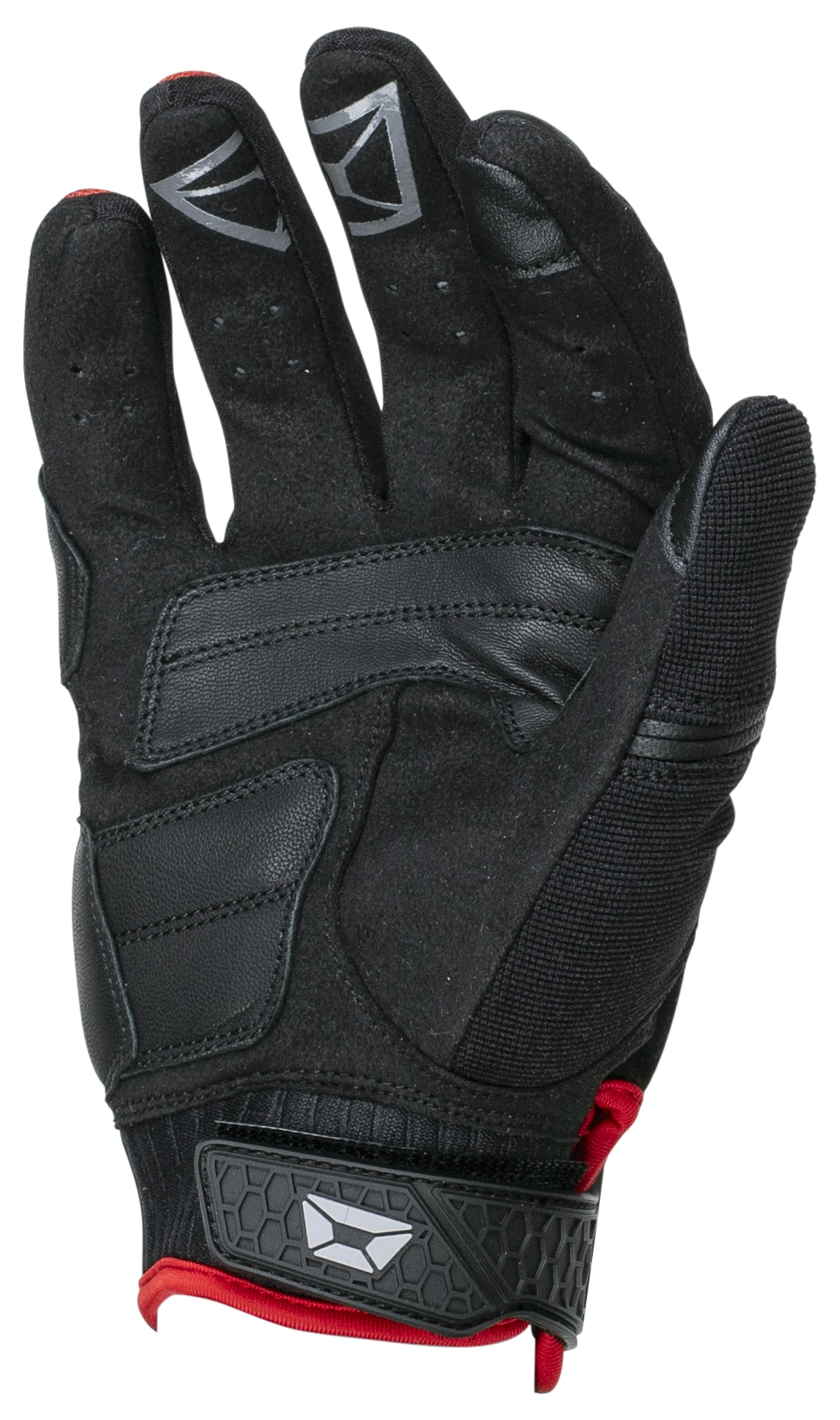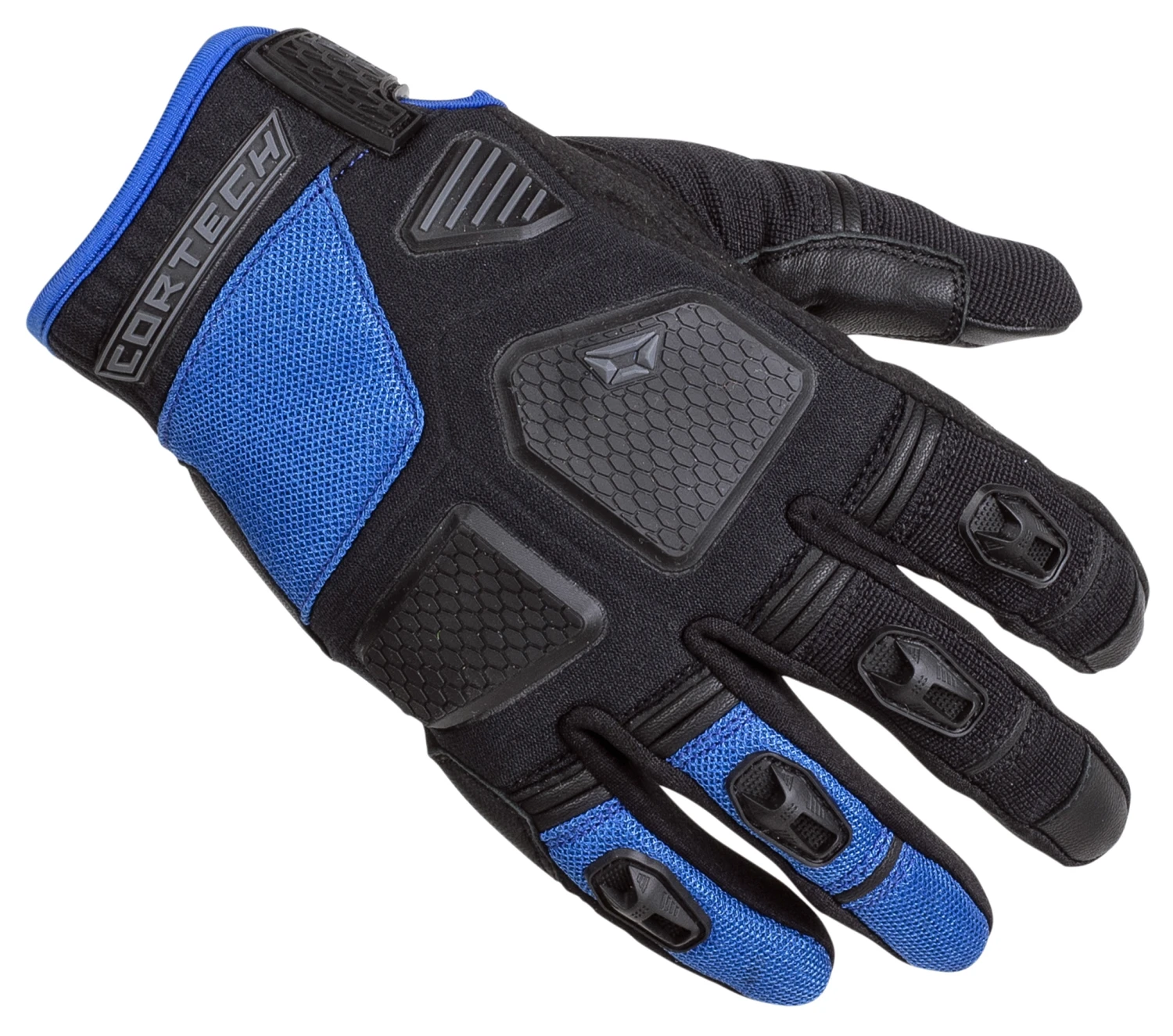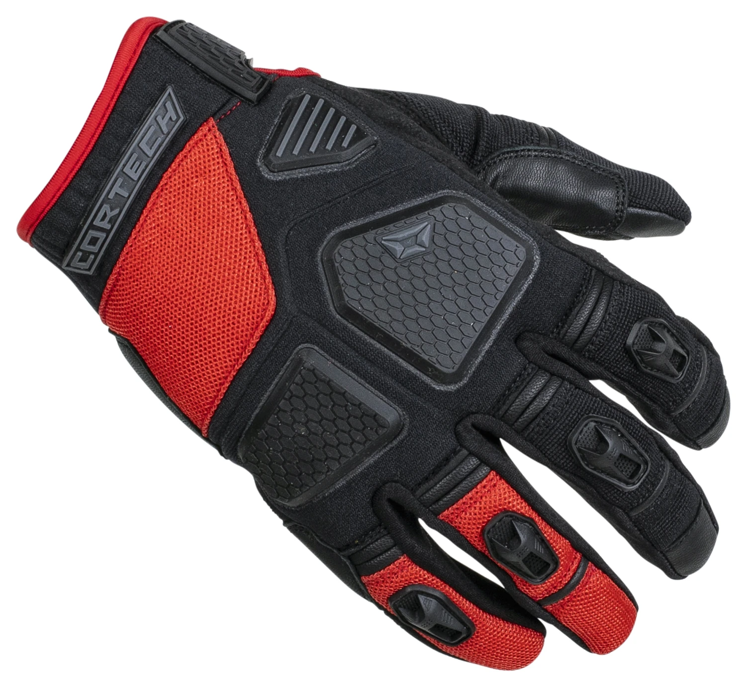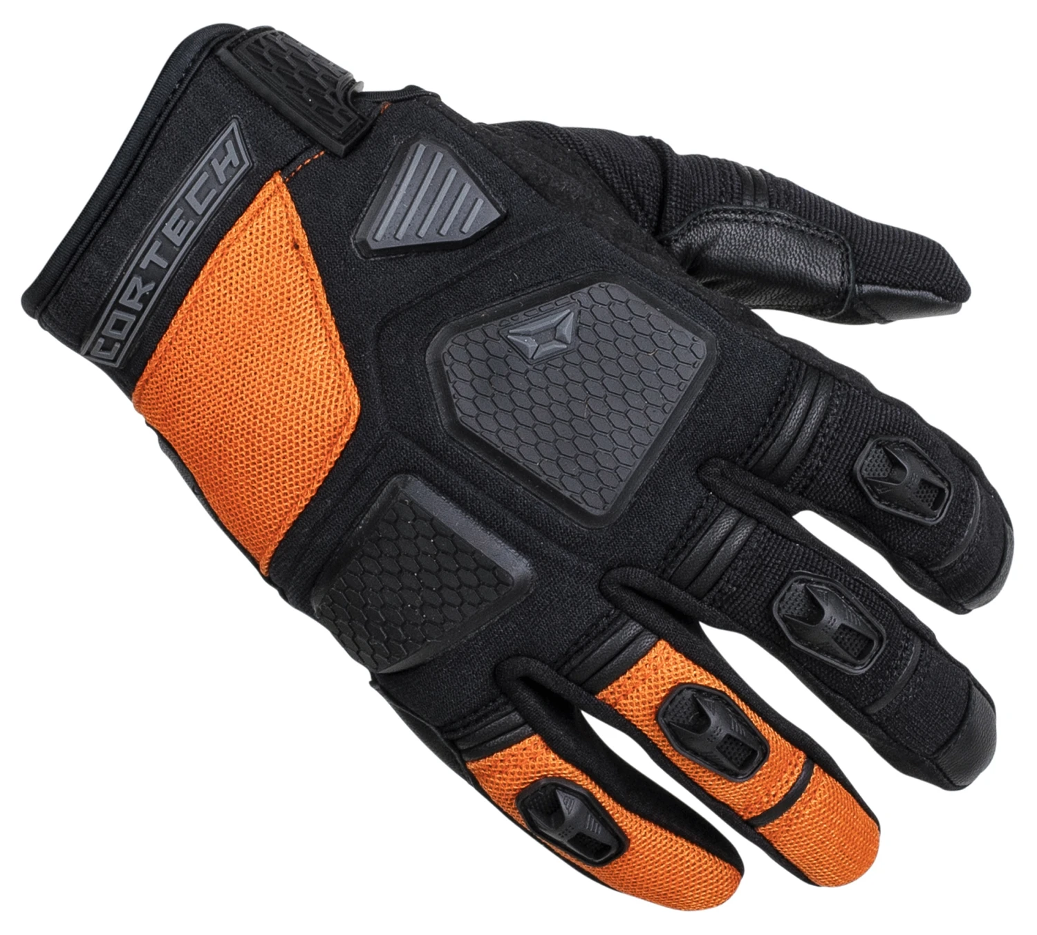 The summer weather Aero-Flo Gloves from Cortech use genuine goat hide overlays over a Clarino synthetic leather chassis. Critical areas at the side of the palm receive additional goat leather and impact padding. Air flowing textiles and perforation abound – with the hard TPR finger sliders even receiving vent holes. Touchscreen friendly index finger and thumb communicate easily with smart devices. When it comes to fit, comfort is an easy box to check with neoprene at the back of hand and a combination of Lycra and spandex used along the fingers. Â